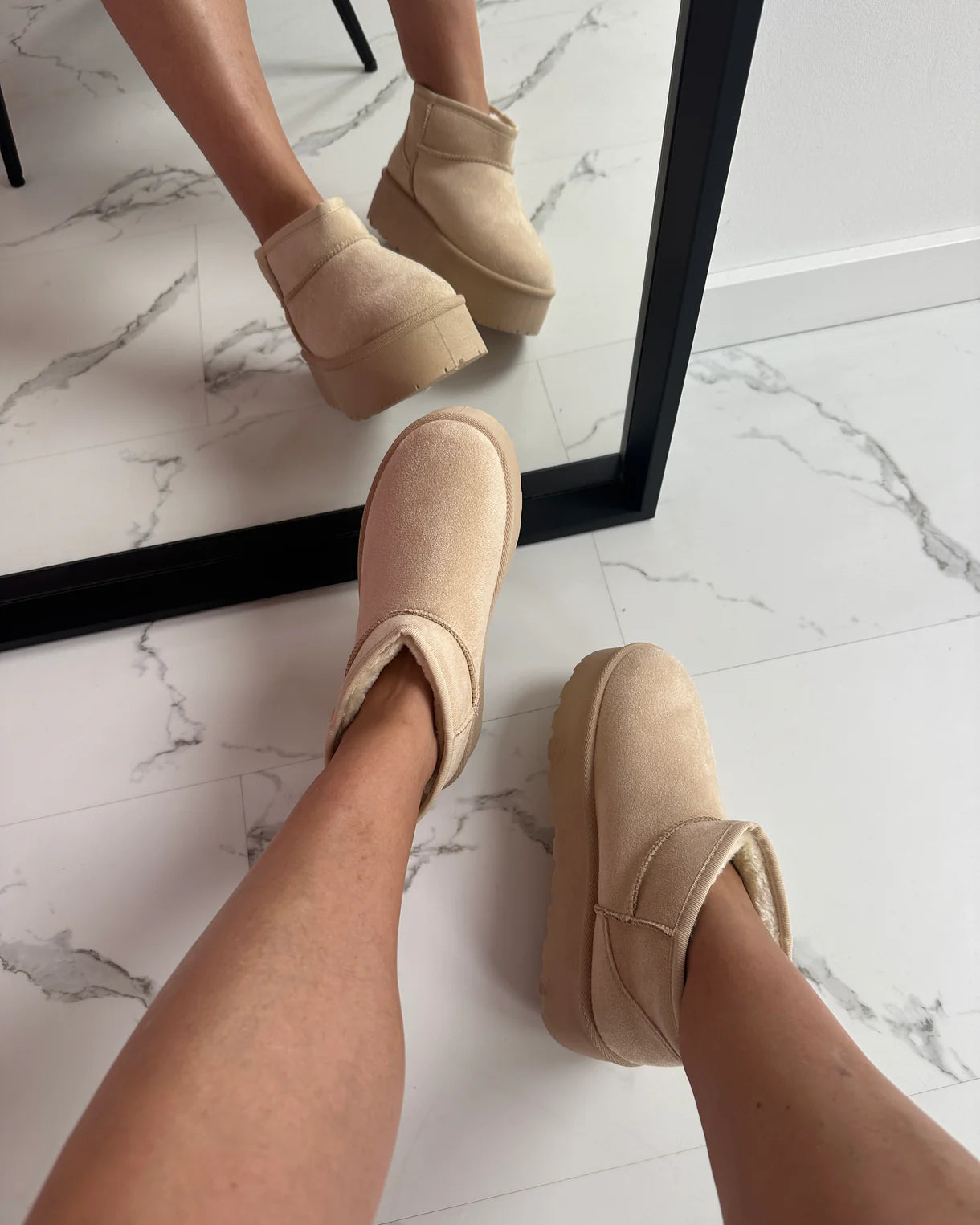 Fabricadas en ante de alta calidad, con forro a juego, combinan una estética limpia con funcionalidad real. La altura de 9 cm (sin incluir la suela) proporciona protección térmica sin renunciar a la movilidad. Ideales para uso diario, largas caminatas y cualquier rutina invernal.